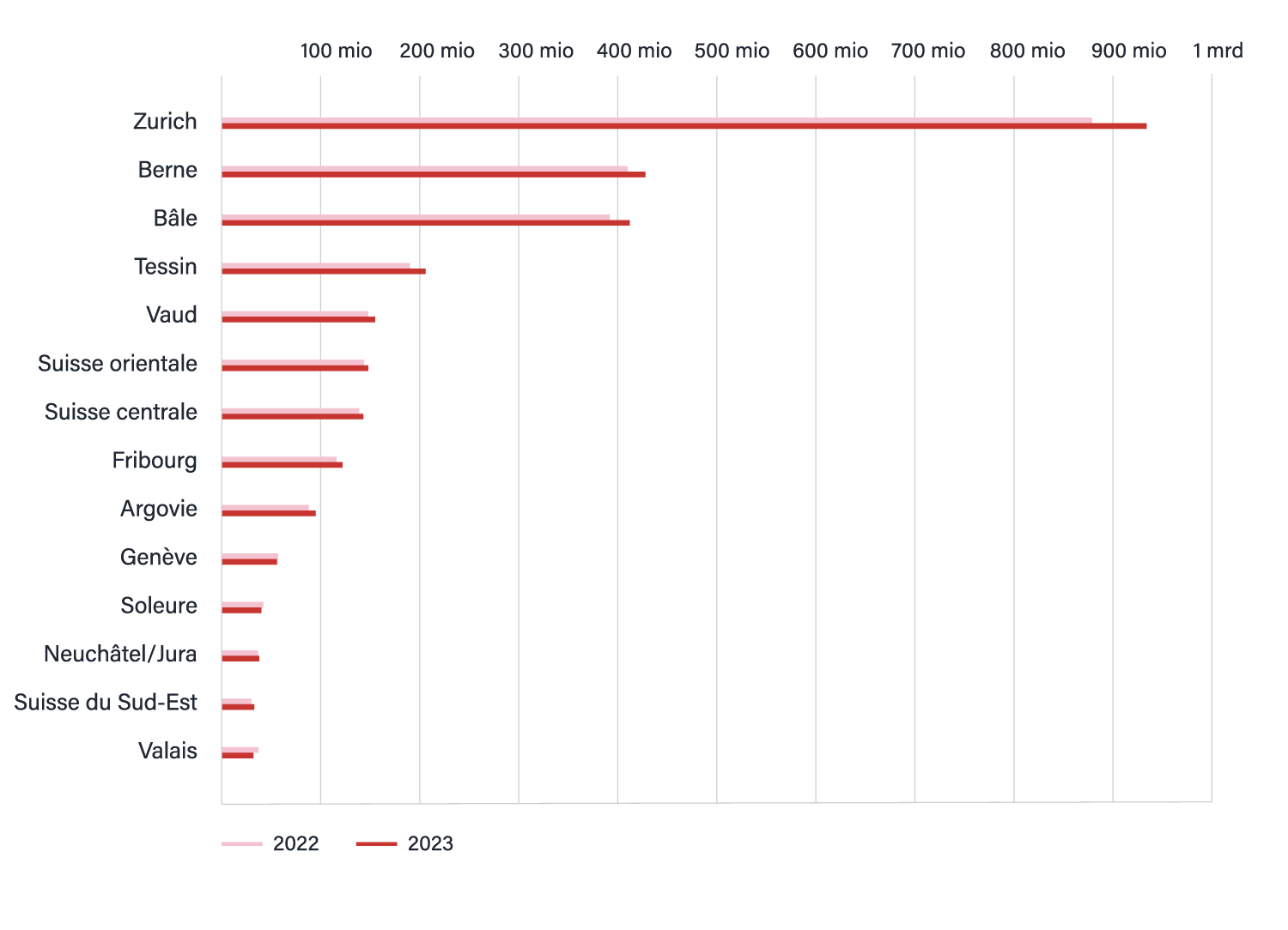 Nombre d’entreprises membres et filiales2022:1062023:105Nombre de collaborateurs2022:7702023:790Taille moyenne des entreprises (nombre moyen de collaborateurs par entreprise)2022:7.262023:7.52Chiffre d’affaires brut des entreprises membres, par région (en millions de CHF)2022:1392023:143 -