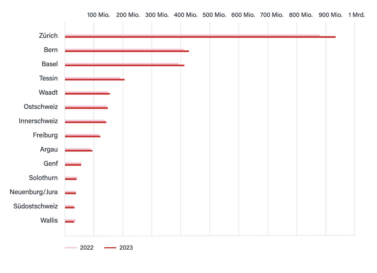 Mitgliedsunternehmungen und Zweigstellen2022:10212023:1036Mitarbeiterzahlen2022:15 0122023:15 798Durchschnittliche Anzahl Mitarbeitende pro Unternehmung2022:14.702023:15.25Bruttoumsatz der Mitgliedsunternehmen pro Region in Mio.2022:27092023:2852